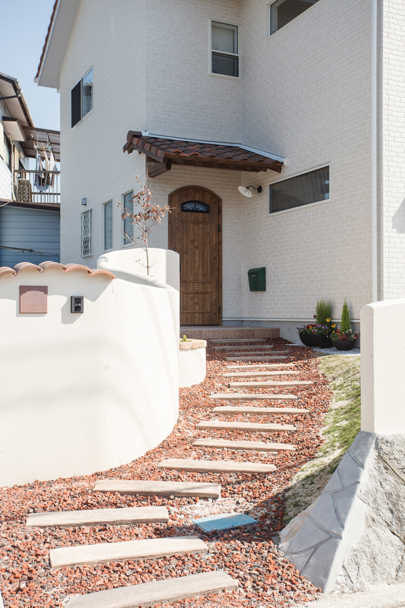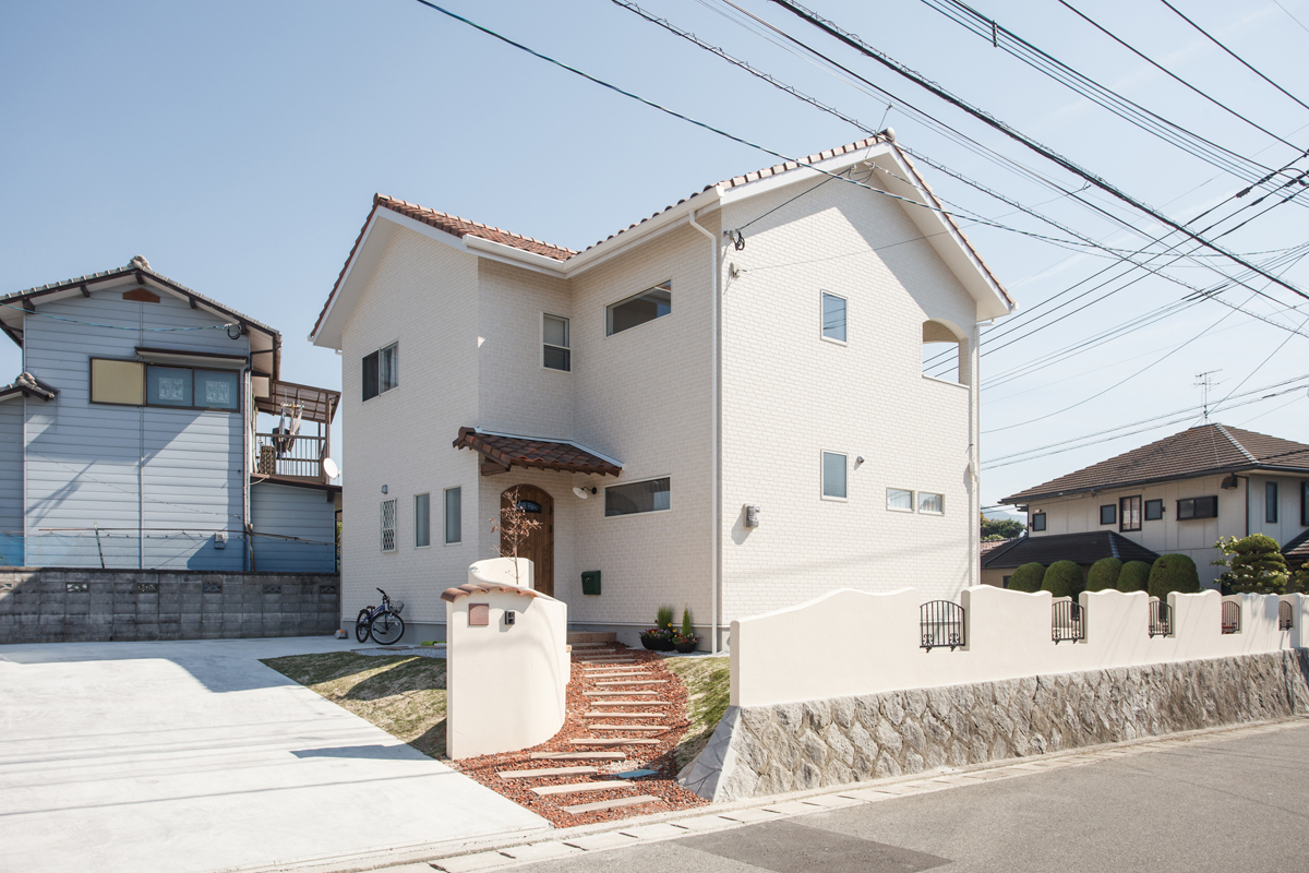 真っ白な塗壁に建具やタイルでアクセントをつけた明るくてかわいい家