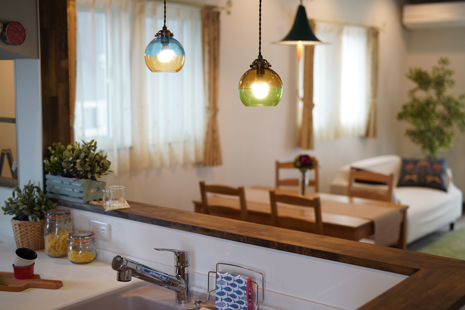 ミントグリーンの造作キッチンカウンターがポイントのナチュラルフレンチの家