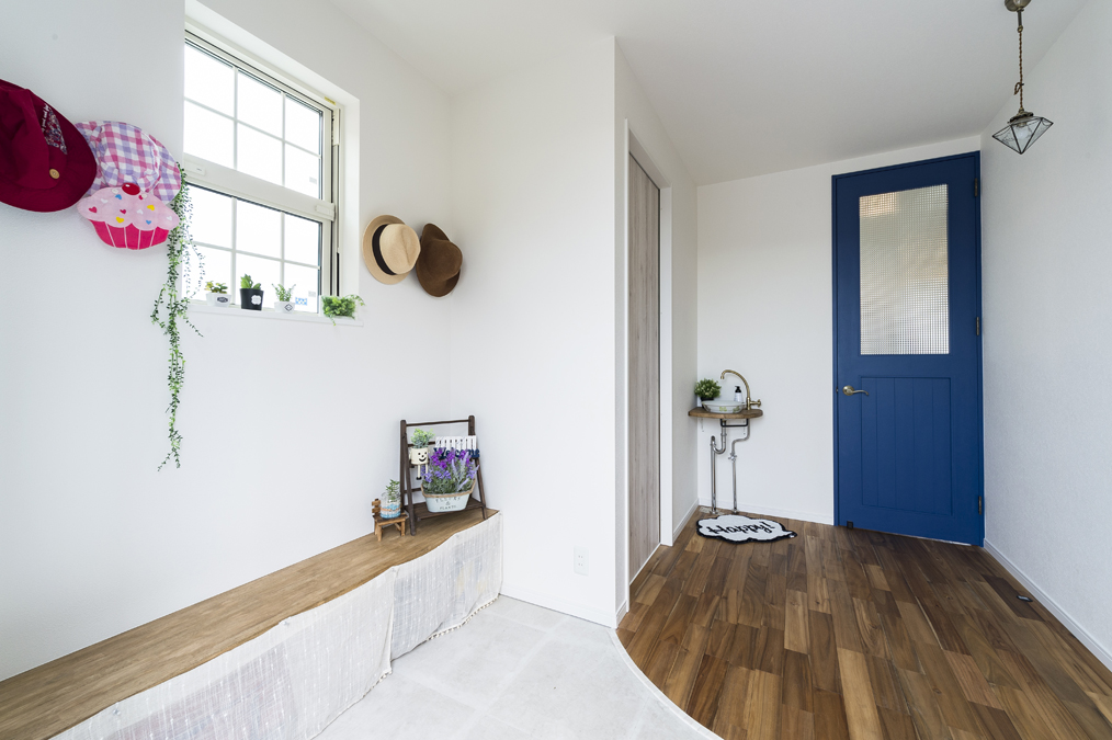 真っ白な塗壁に建具やタイルでアクセントをつけた明るくてかわいい家