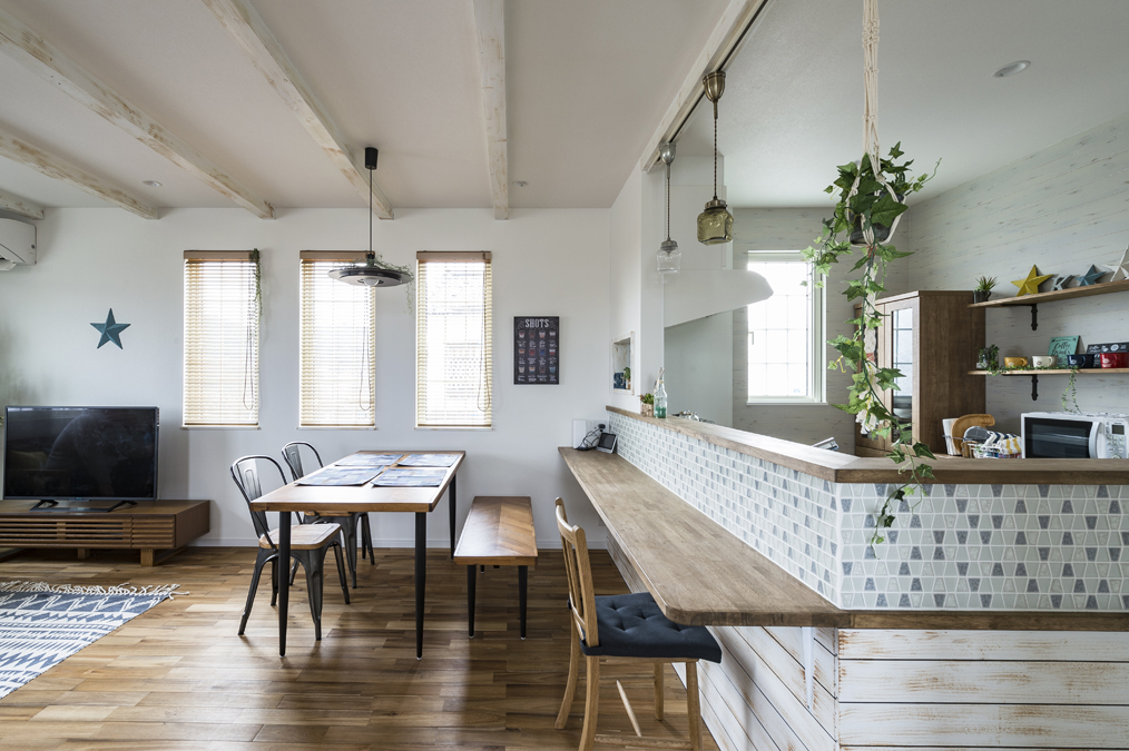 キッチンカウンターを中心に家族が自然と集まるカフェスタイルの家
