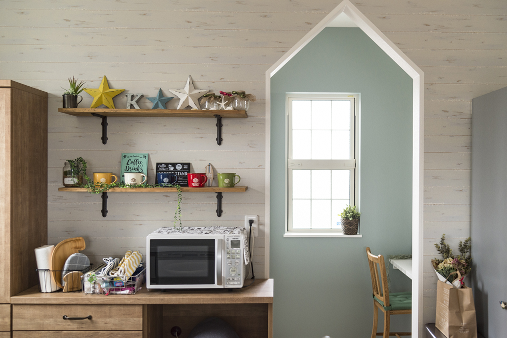 ミントグリーンの造作キッチンカウンターがポイントのナチュラルフレンチの家