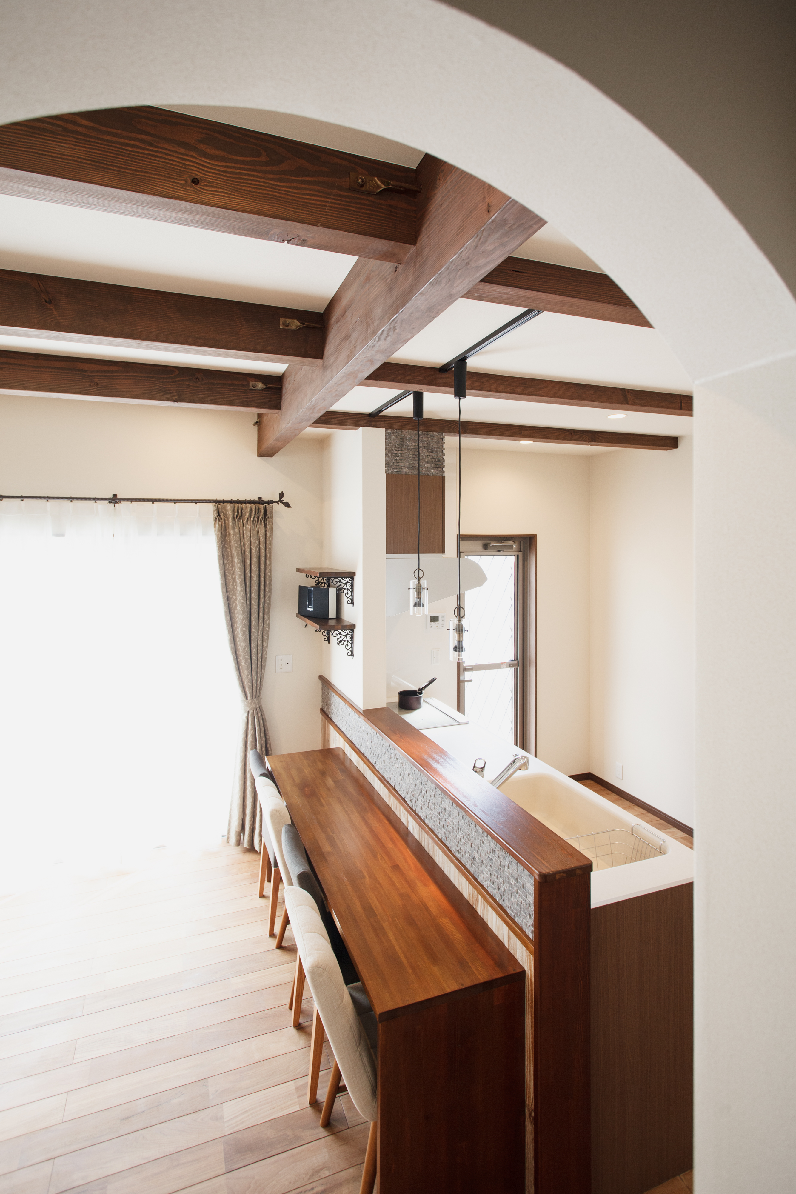 キッチンカウンターを中心に家族が自然と集まるカフェスタイルの家